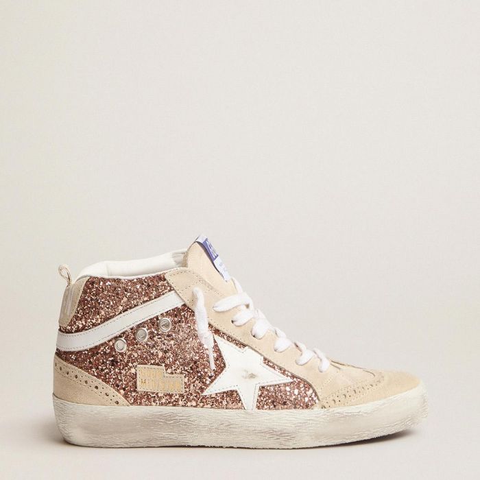 مظهر غير رسمي ينضح بأناقة الملابس街头风: هذا النموذج الذي يفسر أسلوب Golden Goose بفضل استخدام علاجات وتشطيبات حصرية. هذه الأحذية الرياضية Mid Star تتميز بمزيج من البريق باللون الوردي-الذهبي والجلد المدبوغ في الجزء العلوي، بالإضافة إلى وميض من الجلد الأبيض الذي يتطابق تماماً مع نجمة GGDB.