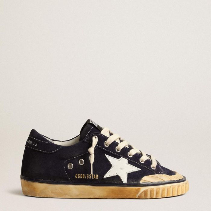 رمز خالد يتسم بالتطور المستمر. في غولدن، نحب أن نأخذ كلاسيكياتنا ونعيد صياغتها بشكل دائم، دائماً من زاوية جديدة. هذه الأحذية سوبر ستار النسائية ذات الجزء العلوي من الجلد السويدي باللون الأزرق الداكن والمميزة بغرز متباين، تتميز بنجمة بيضاء من الجلد وطرف مطاطي بنمط خام. وتضيف الأربطة بلون الكريمي اللمسة الأخيرة.