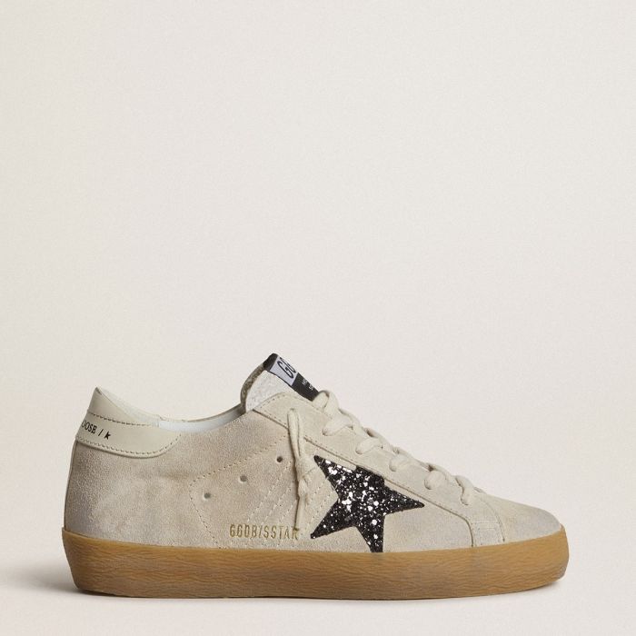 حذاء سوبر ستار للنساء باللون الرمادي الفاتح من الجلد المدبوغ، مع نجمة بريق فضية وشريط كعب من الجلد.
