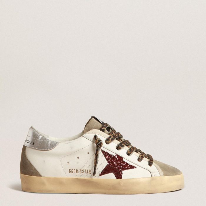 一个永恒的经典,却又在不断发展。在Golden,我们喜欢不断重新设计我们的经典款式,并且总是从新的角度出发。这些Super-Star鞋子采用白色皮革鞋面,配有酒红色闪粉星星、银色覆膜皮革鞋跟标签和鸽灰色绒面革嵌片,例如鞋舌和后部嵌片。而米色和棕色豹纹鞋带则增添了最后的点缀。
