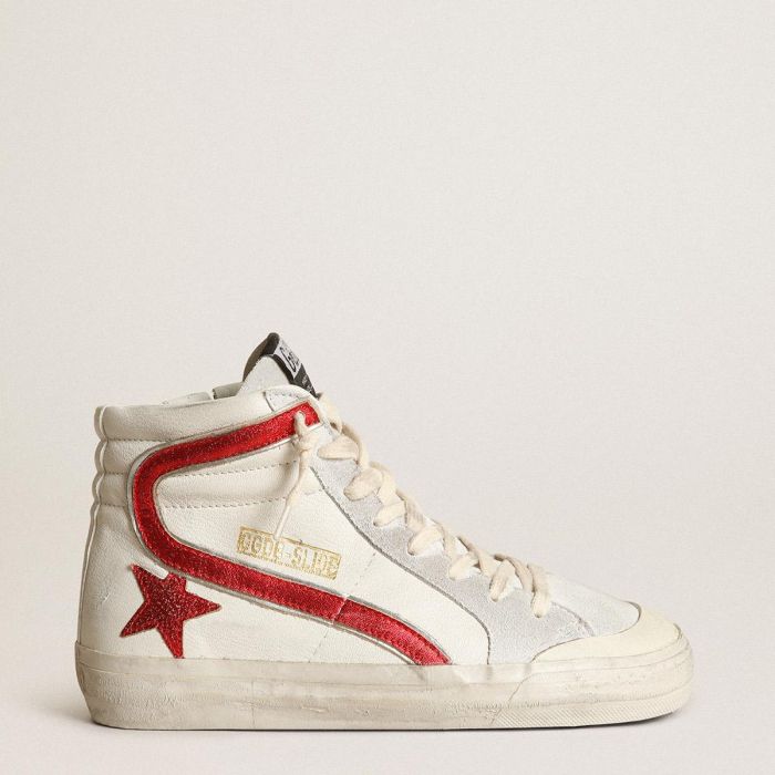 滑板之魂,迷人风范。我们的幻灯片运动鞋直接带你前往威尼斯海滩,在腾空翻转和踢翻之间穿梭。这款白色纳帕皮革鞋面的款式配有红色层压皮革嵌件,例如边缘为银色层压皮革的星星和闪光。米白色的麂皮鞋舌和奶油色鞋带锦上添花。
