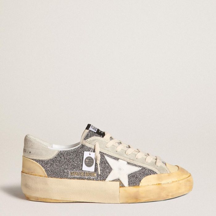 一个永恒的标志,却又在不断演变。在Golden,我们喜欢不断重新塑造我们的经典款式,始终从新的角度出发。这款限量版男士鞋款采用银色施华洛世奇闪粉鞋面,配有白色皮革星星和奶油色麂皮后跟标签。米色橡胶鞋头和奶油色鞋带增添了时尚的 finishing touch。