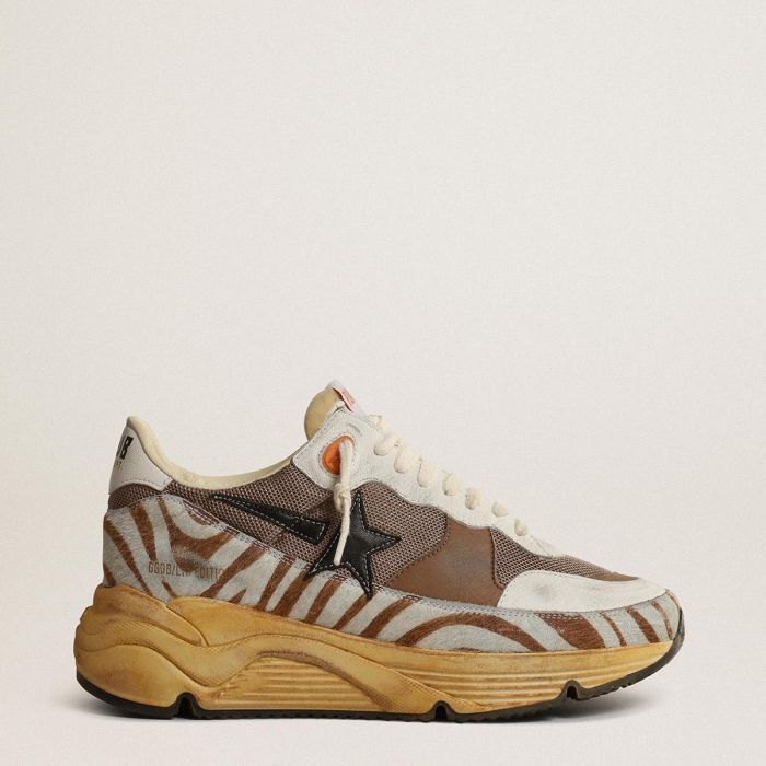 - 棕色织物和白色与驼色斑马纹小马皮鞋面