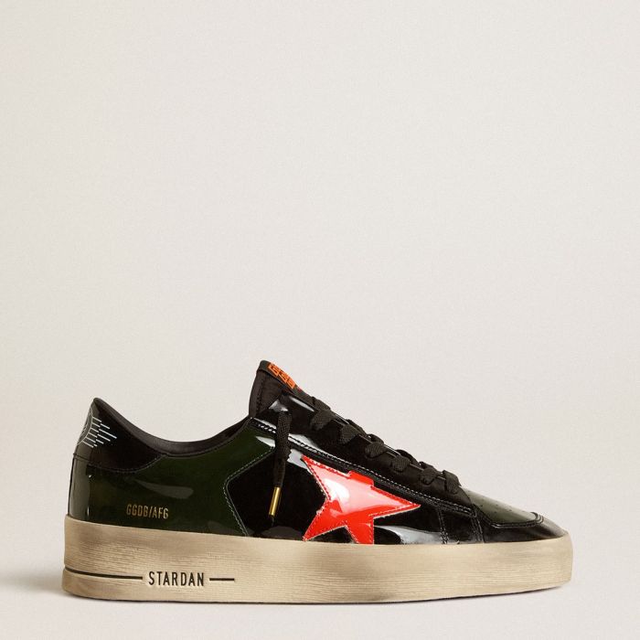 黑色和绿色漆皮材质的男士Stardan LAB运动鞋,配有橙色星星
