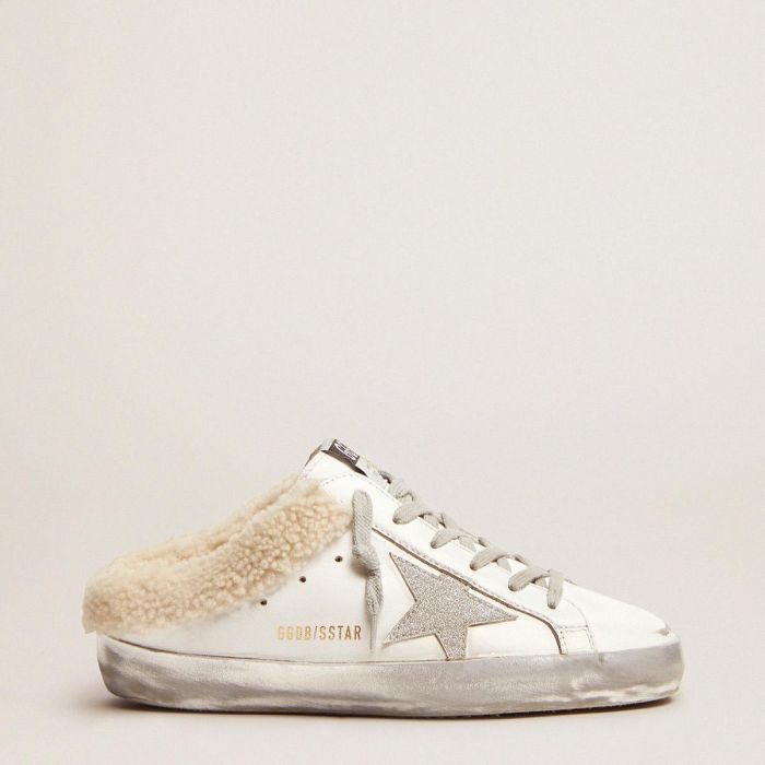 我们标志性的运动鞋全新懒人鞋版本:这些Super-Star运动鞋采用白色皮革经典鞋面和柔软的羊毛皮内衬。银色闪粉星星点缀完善了整体造型。