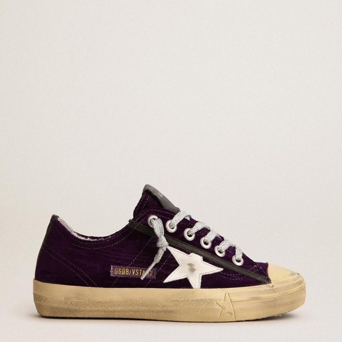 简约之美:我们的V-Star运动鞋将简约造型与时尚细节完美结合。这款鞋的紫色天鹅绒鞋面配有白色皮革星星图案和黑色皮革后跟标签,银色鞋带更添点睛之笔。