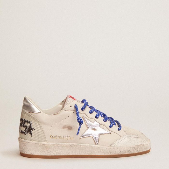 Soñando con los años ochenta. Nuestras zapatillas Ball Star tienen un ambiente universitario americano entre un tiro a canasta y una vuelta en monopatín. Este modelo con parte superior de piel napa blanca presenta una estrella y una tapa del talón de piel laminada en plata y un inserto de piel agrietada blanca en la puntera. El inserto de goma texturizada a tono y los cordones azules con lunares blancos añaden el toque final: cosas bellas que nunca pasan de moda.
