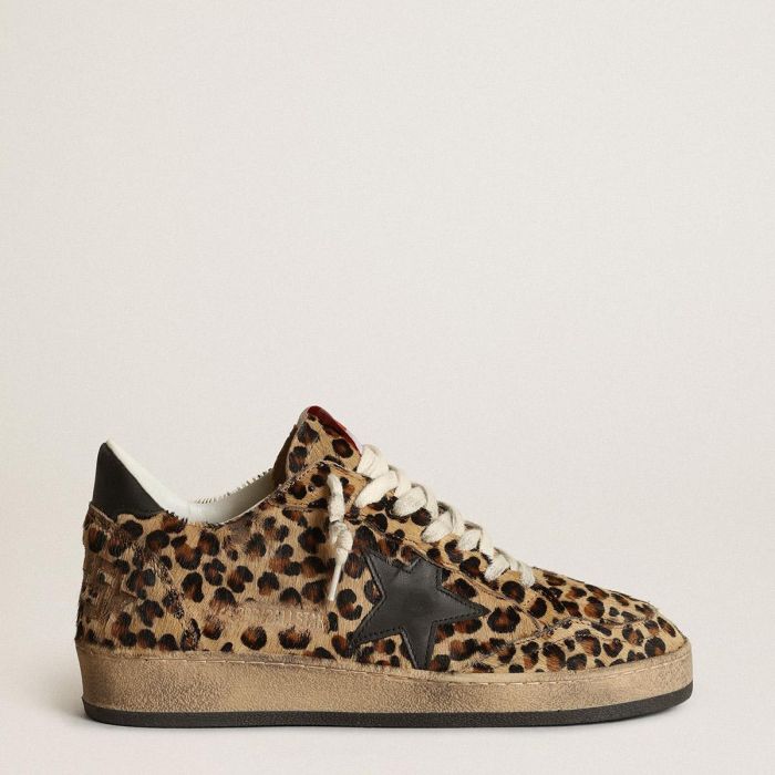 Soñando con los ochenta. Nuestras zapatillas Ball Star tienen un ambiente universitario americano entre un tiro a canasta y una vuelta en monopatín. Este modelo en piel de potro estampada de leopardo con matices de color beige y marrón presenta una estrella y un remate del talón de cuero negro. Los cordones color crema completan el estilo: cosas bellas que nunca pasan de moda.
