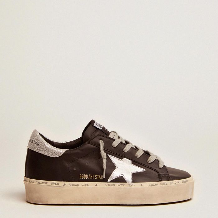 दोहरी ऊंचाई और प्रतीकात्मक डिजाइन: हमारे सुपर-स्टार स्नीकर्स से प्रेरित, हाई स्टार स्नीकर्स में दोहरी फॉक्सिंग होती है, जिसे हाथ से लिखे गए अक्षरों से सजाया गया है। यह काले चमड़े का मॉडल चाँदी जैसे परतदार चमड़