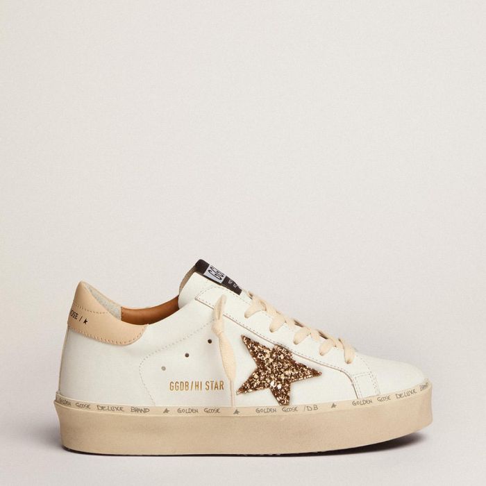 दोहरी ऊंचाई और प्रतिष्ठित डिजाइन: हमारे सुपर-स्टार स्नीकर्स से प्रेरित, हाई स्टार स्नीकर्स में दोहरी फॉक्सिंग है, जिसे हाथ से लिखे अक्षरों से सजाया गया है। ये सफेद चमड़े के ऊपरी भाग वाले स्नीकर्स स्वर्ण चमकदार तारे और बेज चमड़े के हील टैब से सुसज्जित हैं। और क्रीम रंग की श