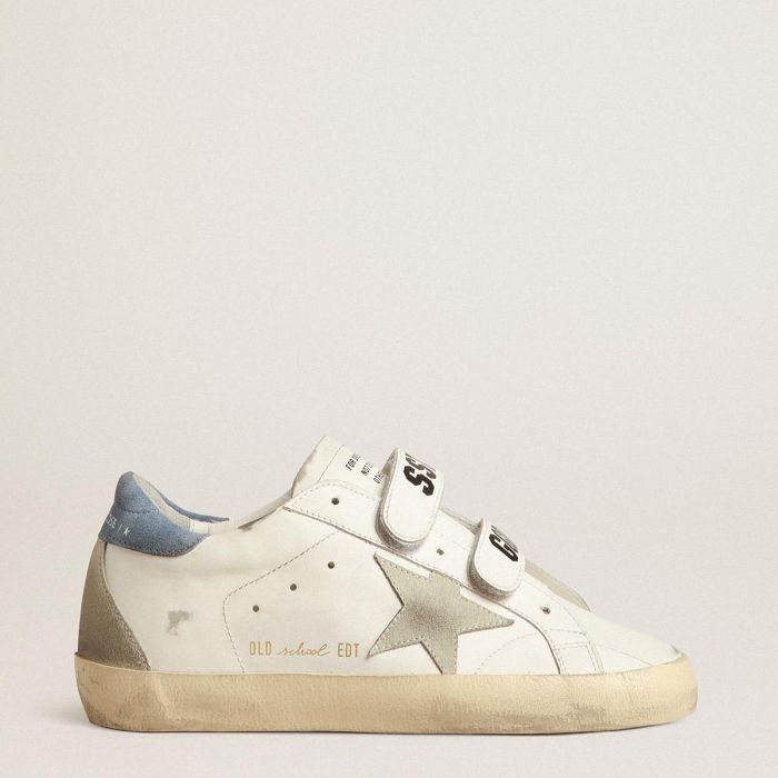 हमारे ओल्ड स्कूल स्नीकर्स में विपरीत लोगो के साथ दो वेलक्रो पट्टियाँ हैं। यह सफेद चमड़े का मॉडल आइस-ग्रे सुएड इनसर्ट्स की विशेषता है, जैसे कि स्टार और पीछे का इनसर्ट, और पाउडर-ब्लू हील टैब।
