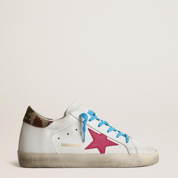 एक समयहीन आइकन जो लगातार विकसित होता रहता है। गोल्डन में, हमें हमारे क्लासिक्स को लेकर उन्हें हमेशा एक नए कोण से दोबारा काम करना पसंद है। यह सीमित संस्करण में, सफेद चमड़े के इन महिलाओं के सुपर-स्टार स्नीकर्स में कैमफ्लेज हील टैब और फुक्शिया स्टार शामिल हैं। फीरोजा रंग के शू ले