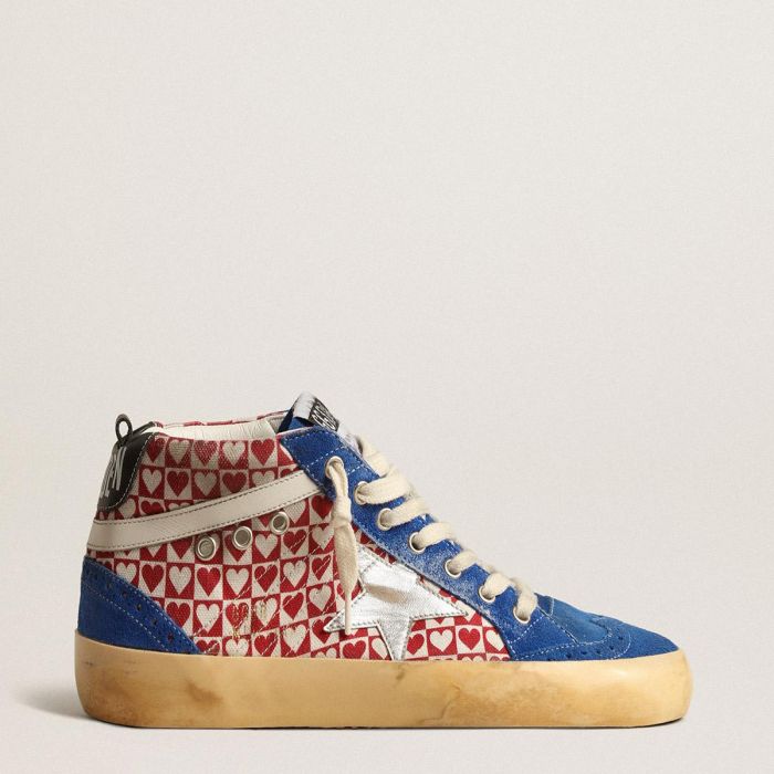 唯一無二の優雅な汎用性: ミッドスター スニーカーは、1980年代のスケートシーンからインスピレーションを受け、洗練されたデザインに仕上げられています。このウィメンズモデルは、赤と白のチェック&ハート柄のキャンバスアッパーに、シルバーのラミネートレザーのスターとクリーム色のレザー フラッシュが特徴です。ブルーのスエードインサート、ブラックレザーのヒールタブ、そしてクリーム色のシューレースが全体のデザインを完成させています。