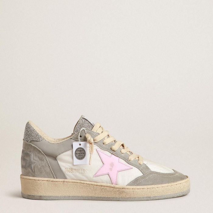 1980年代への憧憬。私たちのBall Starスニーカーは、バスケットボールのシュートとスケートボード遊びの間のようなアメリカのカレッジ感覚を持っています。ホワイトナイロンとグレーレザーのアッパーを持つこのモデルには、ベビーピンクのレザースターと、タンやヒールタブなどのシルバーカラーのスワロフスキーマイクロクリスタルの装飾が施されています。アイスグレーのスエードのアクセントとクリーム色のシューレースが最後の仕上げを加えています:それは決して時代遅れにならない美しいデザインです。