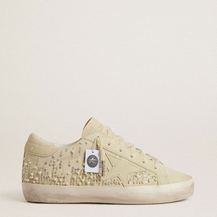 パールとスワロフスキークリスタルをあしらったベージュスエードの女性用スーパースター