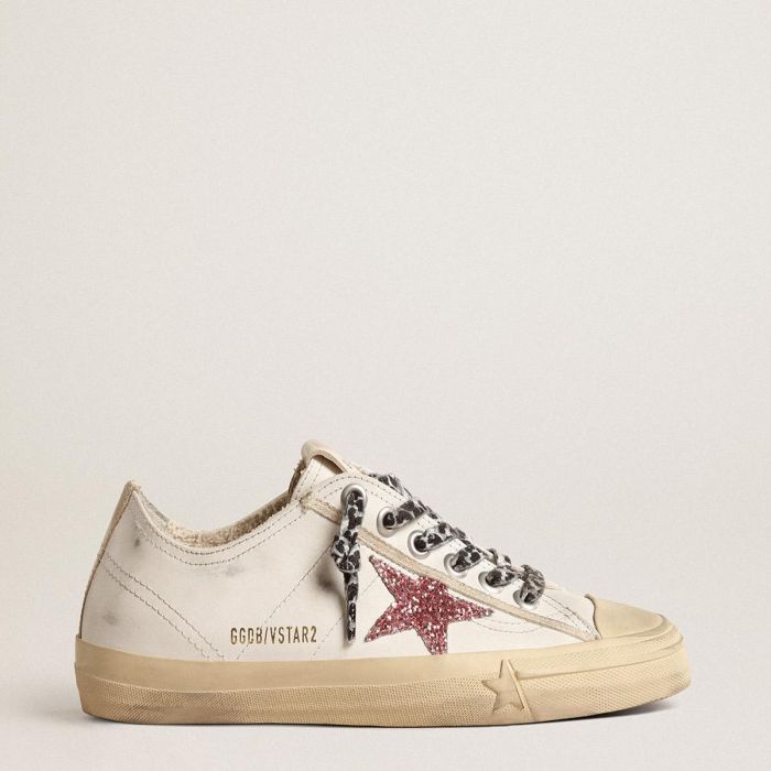 シンプルさの中に宿る美しさ:私たちのV-Starスニーカーでは、洗練されたフォルムとスタイリッシュなディテールが融合しています。このホワイトレザーのアッパーを持つモデルは、ピンクのグリッタースターとプラチナメタリックレザーのヒールタブが特徴です。白と黒の色合いを持つレオパードプリントのシューレースが最後の仕上げを加えています。