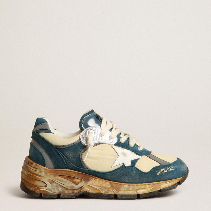 풍부한 이야기를 담은 영혼: 우리의 Dad-Star 스니커즈는 세대를 걸쳐 전해질 수 있도록 디자인된 시대를 초월한 스타일을 가지고 있습니다. 신발을 햇빛에 걸어두는 아이디어를 표현하는 변색된 밑창과 같은 정교한 디테일이 풍부하며, 이 여성용 버전은 청록색 스웨이드와 베이지색 나일론 소재의 겉감에 흰색 가죽 별과 반사 소재 삽입된 청록색 스웨이드 힐 탭으로 강조되었습니다. 실버 아일렛과 크림색 끈이 마무리 터치를 더합니다.
