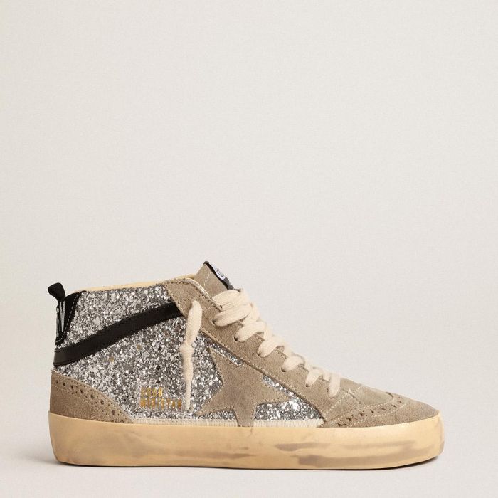 독특하고 우아한 다재다능함: 미드 스타 스니커즈는 90년대 스케이트 씬에서 영감을 받은 정교한 디자인을 선보입니다. 실버 글리터 어퍼가 특징인 이 모델은 비둘기 회색 스웨이드 인서트, 스타와 혀 부분이 있으며 블랙 가죽 플래시가 있습니다. 브로귀잉 디테일, 블랙 스웨이드 힐 탭 및 크림색 끈이 전체적인 모습을 완성합니다.