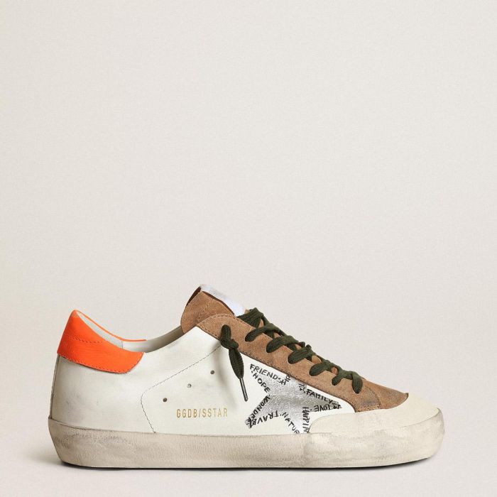 시간을 초월한 아이콘임과 동시에 끊임없이 진화하는 제품입니다. 골든에서는 클래식한 디자인을 새롭게 재해석하는 것을 좋아하며, 항상 새로운 관점에서 접근합니다. 화이트 가죽 어퍼를 사용한 이 모델은 가장자리에 검정색 그래피티 효과 글자가 돋보이는 은색 스크린 프린트 스타와 형광 오렌지 가죽 힐 탭이 특징입니다. 담배색 스웨이드 혀 부분과 삽입부, 그리고 다크 올리브 그린 끈이 최종적인 마무리를 더해줍니다.