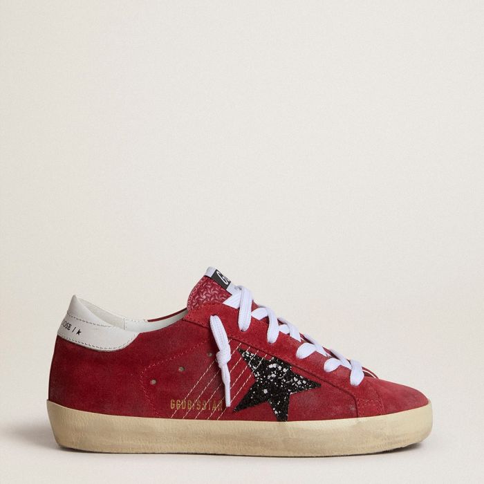 글리터 스타와 화이트 힐 탭이 있는 레드 스웨이드 여성용 슈퍼스타