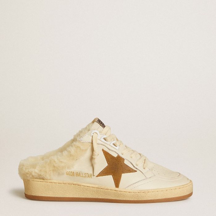 스웨이드 별과 베이지 색 셰어링 안감이 특징인 가죽 소재의 볼 스타 샌들